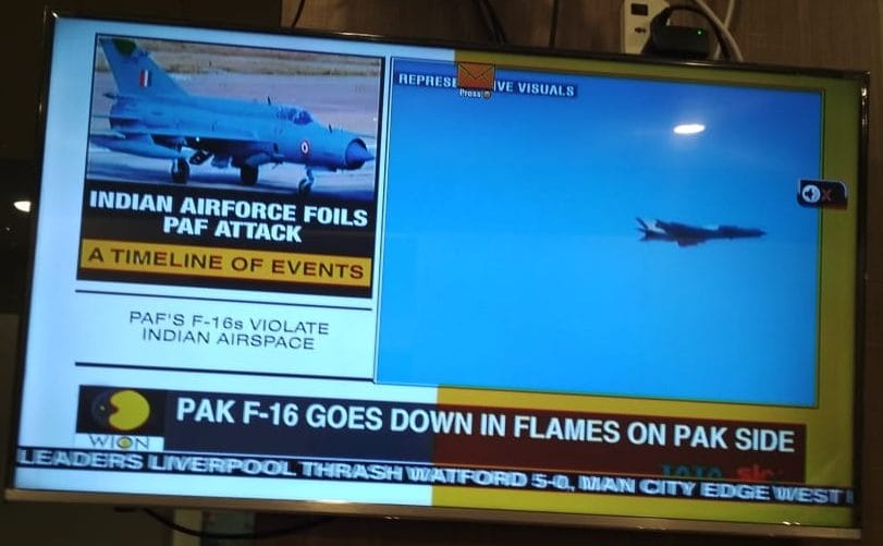 Indian news channels celebrated this success until early afternoon, barring NDTV 24×7, which was treading so carefully it refused to even mention the F-16 until lunch time, preferring to show us the remains of an Indian helicopter crash in flames.