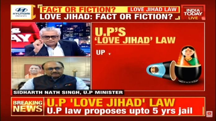When Shaukat Ali, who was falsely described as a ‘for love-jihad’ panelist, called the ordinance “sexist and misogynist”, and argued that young women ought be allowed to choose whom they want to marry, irrespective of religion, the two anchors Laxmi and Sweta pounced on her, angrily: don’t you know that men are using “love jihad” to “fool women” into conversion, they asked. According to them, the ordinance was pro-women — “Was it not necessary for a girl’s security?” Lakshmi asked lawyer Pragya Bhushan who promptly agreed.