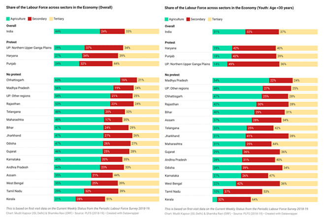 Using the unit-level data on the current weekly status of The Periodic Labour Force Survey for 2018–19, the author finds that the share of agriculture in Punjab was 24 percent, in Haryana, it was 27 percent, and in the Northern Upper Ganga Plains of UP, it was 29 percent, while at the national level, the share of the labour force in the agriculture sector was 44 percent. In terms of the youth (age <30 years) labour force, the analysis reveals that the share of the youth labour force in agriculture in Punjab, Haryana, and NUGP was less than 20 percent, one of the lowest amongst large states and significantly lower than the national share at 31 percent.