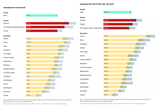 Another possible explanation for protests could be the youth unemployment. However, when we compare Haryana, Punjab, and NUGP with other large states, we find that youth unemployment rates in these states were significantly lower when compared to large states such as Kerala, Bihar, Telangana, Odisha, and Tamil Nadu. From this, it appears that neither the overall unemployment situation nor youth inactivity levels of these regions can be the distinguishing features for Punjab, Haryana, and the NUGP states to emerge as the epicenter of the farmers’ protest last year.