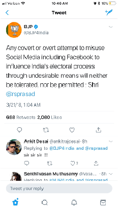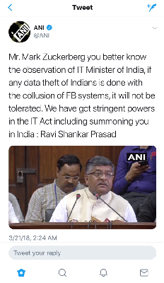 Telecom minister R.S. Prasad sounded a bugle call for war against Facebook if it were to be found guilty of meddling in the Indian electoral process. Zuckerberg could be brought to stand trial in India through the formidable powers of the IT Act.