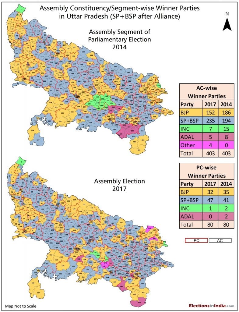 In the 2014 elections, the BSP won zero seats but stood second in 34 of the 80 seats. The SP won five seats and stood second in another 31 seats. No wonder, the two parties have easily decided to contest 38 seats each.