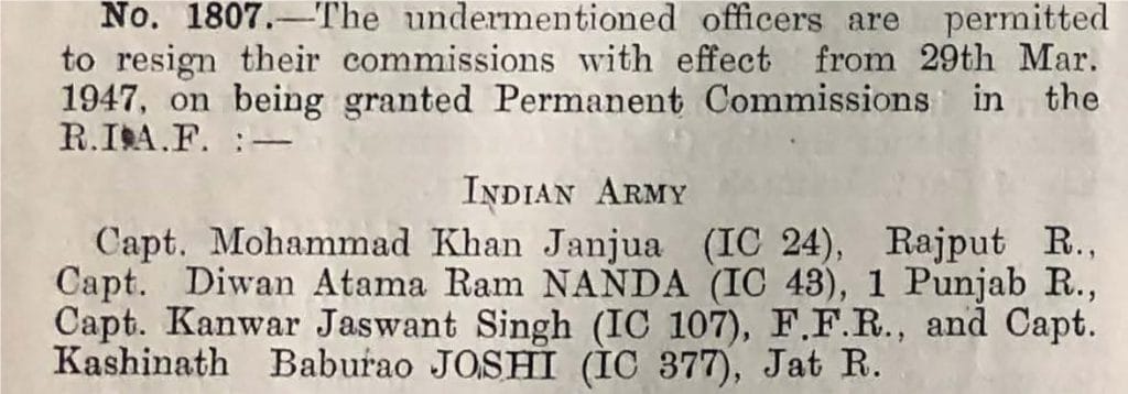 The handful of Army officers who were seconded to the IAF were permitted to wear the Army uniform and ranks along with the IAF wings till they were given Permanent Commission in the IAF, which did not happen until March 1947.