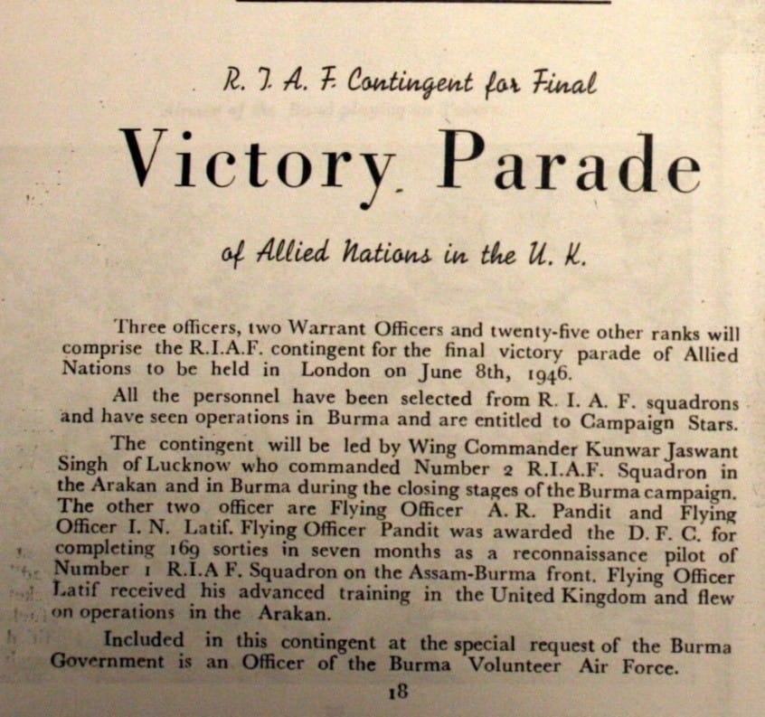 Granted the acting rank of Wing Commander, he was chosen to lead the RIAF Contingent for the Victory Parade in London in June 1946 to celebrate the allied victory in World War II. Incidentally, years later, in 1954, he would also command the ceremonial parade when the IAF was given its presidential colours.