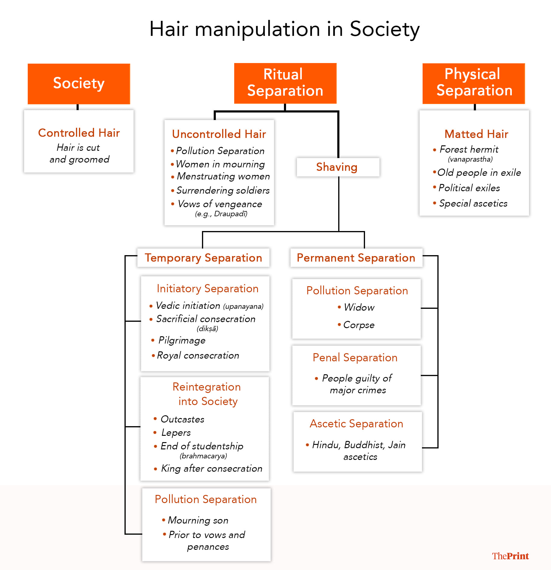 In pre-modern India symbolic manipulations of hair appear as variations of three central themes: (1) groomed control of hair, (2) the ritual shaving of hair on the head (in case of adult males, this may also involve shaving the beard), and (3) the neglect of hair, resulting in either loose and unkempt or dirty and matted, often accompanied by the neglect of nails, and, in the case of males, of the beard. Each of these forms of hair manipulation carried deeply social, widely understood meanings, placing the individual with the manipulated hair in different relationships to people within society. [See chart]