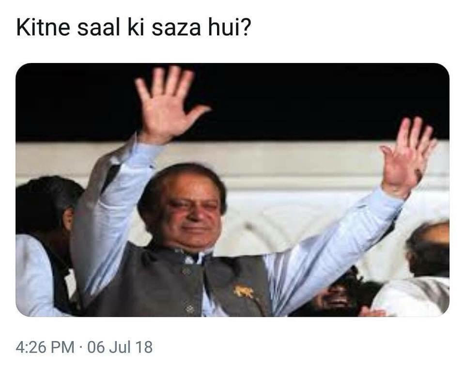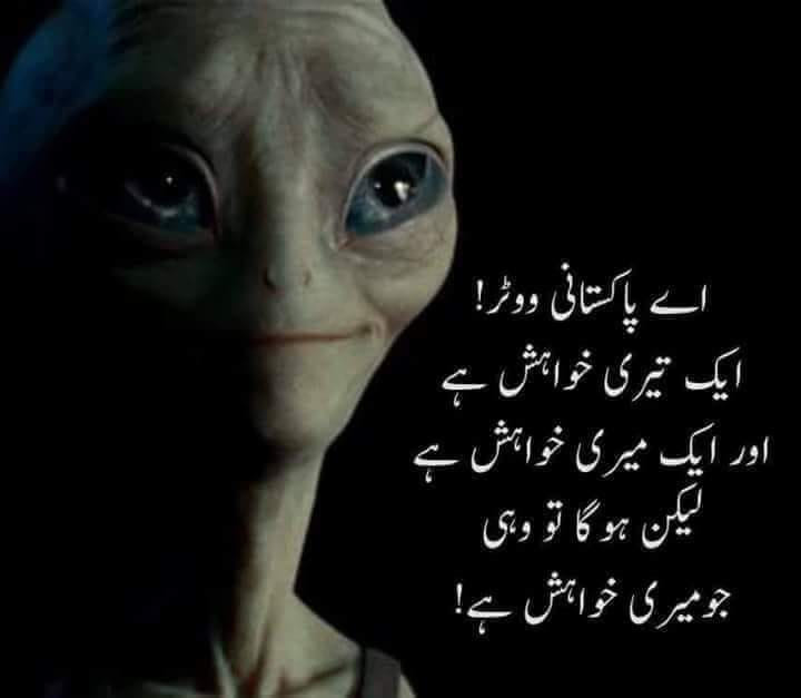 Before going to jail, Nawaz made a new contribution to Pakistan’s lexicon. He started referring to the army establishment as “Khalai makhluq” – creatures from space, or aliens. In the meme below, an alien is saying, “Ay Pakistani voter! Ek teri khwaish hai aur ek meri khwaish hai. Lekin ho ga to wo hi jo meri khwaish hain (O Pakistani voter! You have your wish and I have mine. But it is my wish that will prevail).”