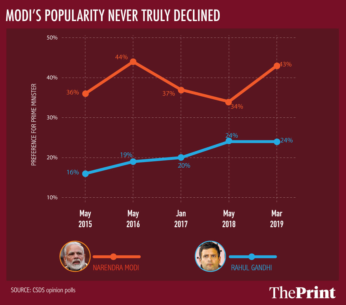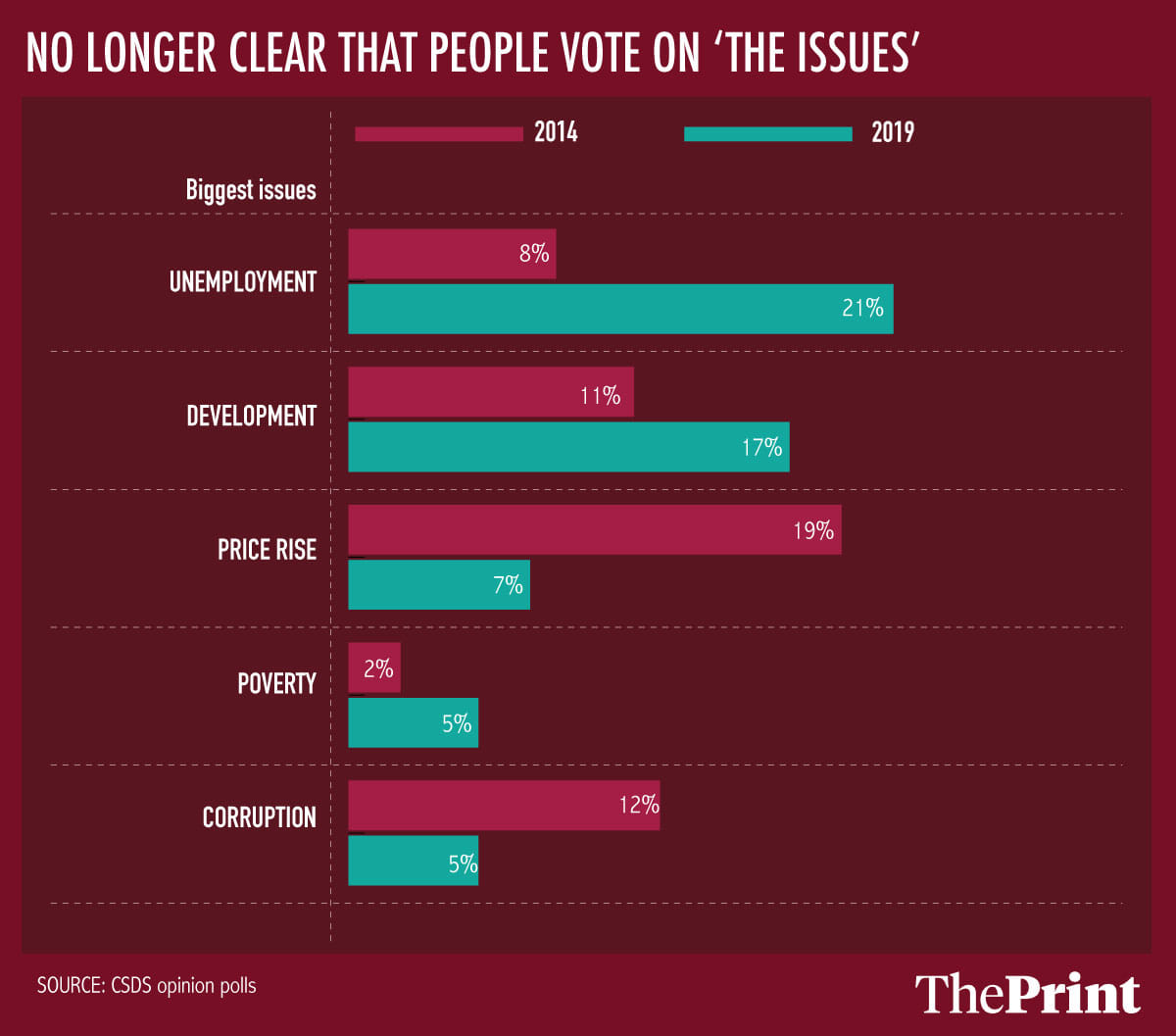 Much of this should not come as a surprise. The issues on voters’ minds, and their beliefs in the abilities of their leaders, have not changed in any significant way between the 2014 and the 2019 elections. Prime Minister Narendra Modi’s personal popularity, which flagged in May 2018, rose before the elections to a higher level than what it was in 2014; and while Congress president Rahul Gandhi’s popularity also rose, the gap between the two remained constant, data from opinion polls conducted by the Centre for the Study of Developing Societies (CSDS) shows.