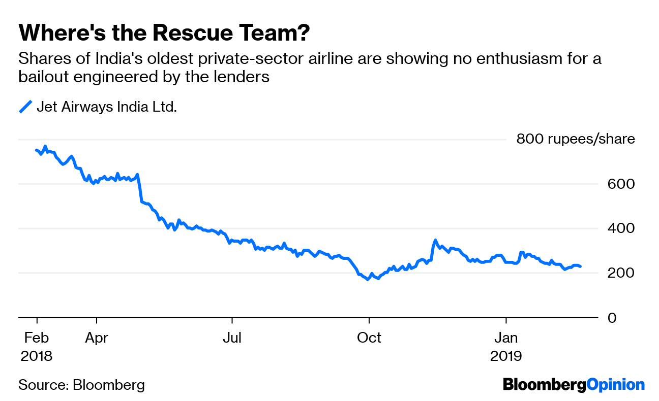 On paper, the plan looks like it may work. Yet Jet shares, which have dropped 70 per cent over the past year, haven’t reacted. After all, minority shareholders will also get diluted together with Etihad and Goyal. The founder might lose his board seat. Who’ll be in the cockpit instead of him? State-owned banks (plus NIIF) will have control, but they don’t know how to run an airline. Besides, even as Jet turns into a semi-state-owned carrier, taxpayers already have another mouth to feed. The government tried to sell 76 per cent of Air India Ltd., together with $5 billion in debt; there were no takers for the unprofitable flag carrier.
