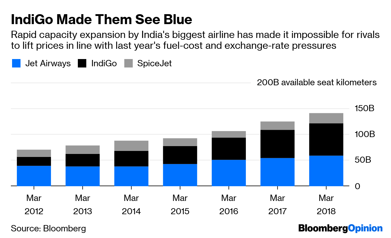Between them, InterGlobe Aviation Ltd.’s IndiGo, Jet Airways and SpiceJet Ltd., the three publicly traded Indian airlines, lost Rs 200 million per day between April and September because of high oil prices and a weak rupee, according to ICRA, the local affiliate of Moody’s Investors Service. And yet the world’s fastest-growing aviation market is gripped by a mad expansion it can’t stop.