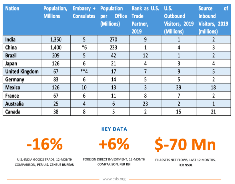 But as outlined in the following chart, the US consular presence in India is spectacularly sparse, especially when considering population. India is a sizeable source of foreign visitors to the United States. Although India is not yet a significant destination for US tourists or college students, these numbers will likely continue to increase in the future.