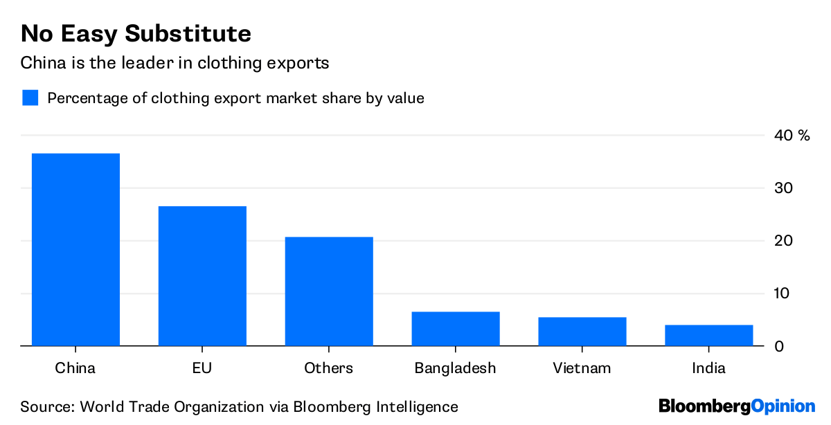 Right now, clothing and footwear aren’t included in the list of Chinese products threatened with punitive duties by the US. But as my colleague, David Fickling has noted, adding another $200 billion would probably mean consumer goods being drawn into the fray.