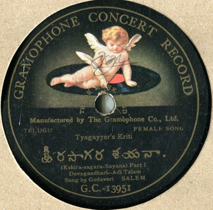 In this double-sided recording, Salem Godavari renders saint Thyagaraja’s composition Ksheera Sagara Shayana in Raga Devagandhari. One notices a distinct variation from contemporary standards in aesthetics when it comes to rendition style, pronunciation and raga exposition. These standards of what “classical” was, came to be defined and codified in the 1930s with the establishment of bodies like the Madras Music Academy.