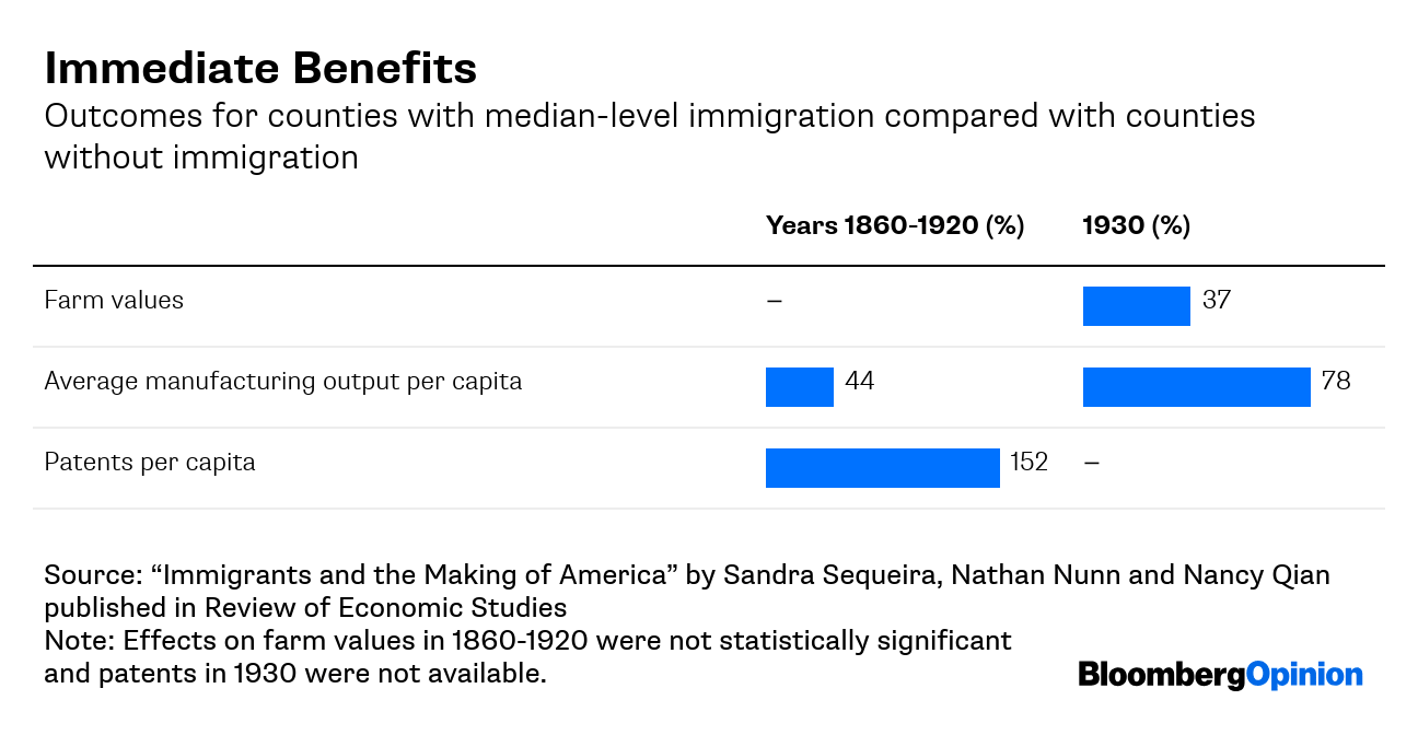 After quantifying the inflow of immigrants into counties across the country, the authors evaluated a range of short and medium-term measures of economic vitality. They found that places that welcomed immigrants recorded more industrialization, more innovation (as measured by patenting rates), higher agricultural productivity and greater economic growth.