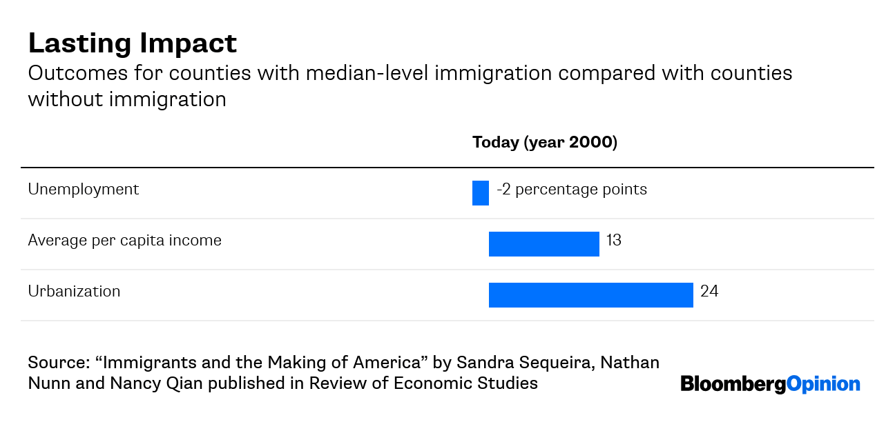 The authors found that today the county that welcomed immigrants would have 2 percent fewer people below the poverty line than the county with no historical immigration. It would also have an unemployment rate 2 percentage points lower and per-capita income that is 13 percent higher.