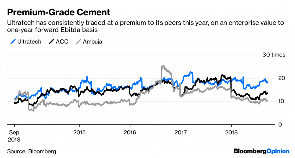 Ultratech is trading at an enterprise value of 16.2 times its one-year forward Ebitda, more than a 60 per cent premium to its peers. If the government doesn’t start spending as fast as India’s largest cement maker, that number might start looking too rich. –Bloomberg