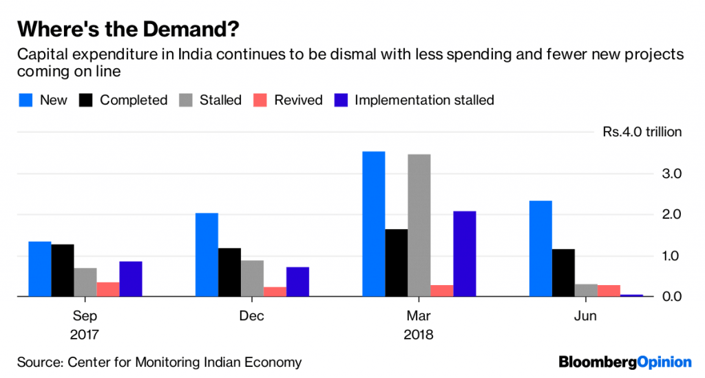 But here’s the wrinkle: Where will all the cement go? Production is growing just south of 10 per cent on year. Big bets on the government’s infrastructure-spending promises (so far, just that) and welfare pledges, like rural housing, are throwing companies into overdrive. Total capital expenditure by the government and companies remains muted, on par with levels in 2004. Public capital-expenditure growth on highways, railways, defense and metro rail projects isn’t ramping up. Companies only expect a 5 per cent increase through mid-2019 from a year earlier, according to a survey by UBS. That’s below expectations for overall demand.