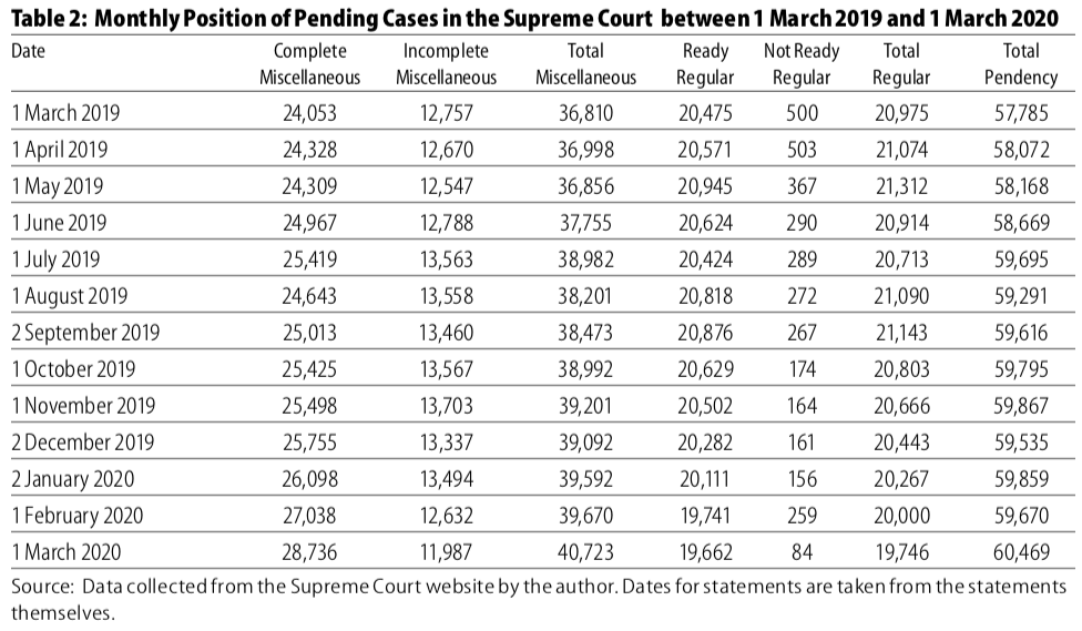 What these numbers suggest is that even prior to the Covid-19-inspired measures hampering the full functioning of the Supreme Court, the number of pending cases had been growing for the past year, but the lack of full functioning has meant that the rate of increase of pending cases has gone up.
