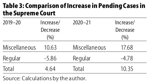 While there is an increase in the number of pending cases in these 12 months as well, the pattern is similar to what is seen in 2020–21: an increase in the number of pending complete miscellaneous cases and decrease in the number of pending regular cases. However, there is a significant difference in the magnitude of the increase between 2019–20 and 2020–21. The comparison is given in Table 3.