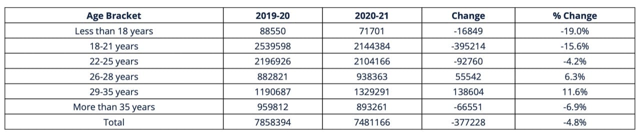 The table below shows us the net payroll numbers for each age group in 2019-20 and 2020-21. It also shows us the absolute change in numbers on a year-on-year basis.