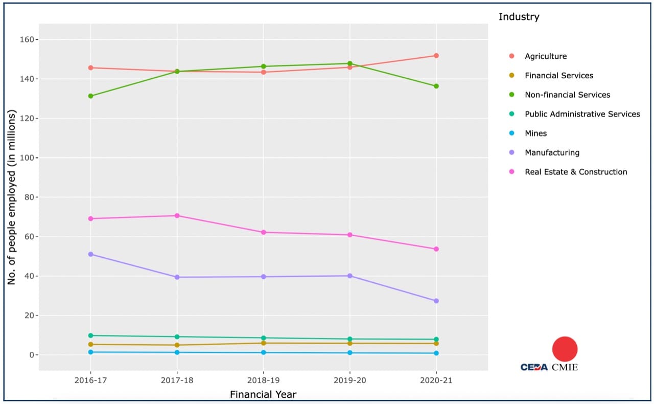 In May 2021, the CEDA-CMIE Bulletin examined long-term sector-wise employment in India. Using CMIE’s time-series data of sector-wise employment (Figure 1), we showed that employment in India’s manufacturing sector had nearly halved between 2016-17 and 2020-21.