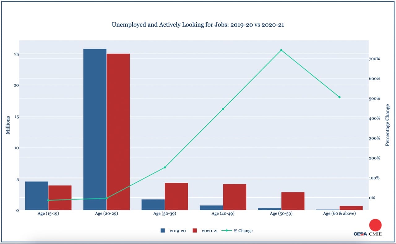 As we wrote, “the biggest setback of the Covid pandemic was to those age groups that are likely to be composed of first-time labor market entrants or the employed youth. The youth, despite their already high unemployment rates, as reported in the PLFS surveys, has perhaps suffered even further with a decline in formal sector jobs. The gap between their aspirations and what is available in the market only seems to have swelled up in the past year. It has set India’s younger workforce back by preventing or delaying their entry into organized employment.”