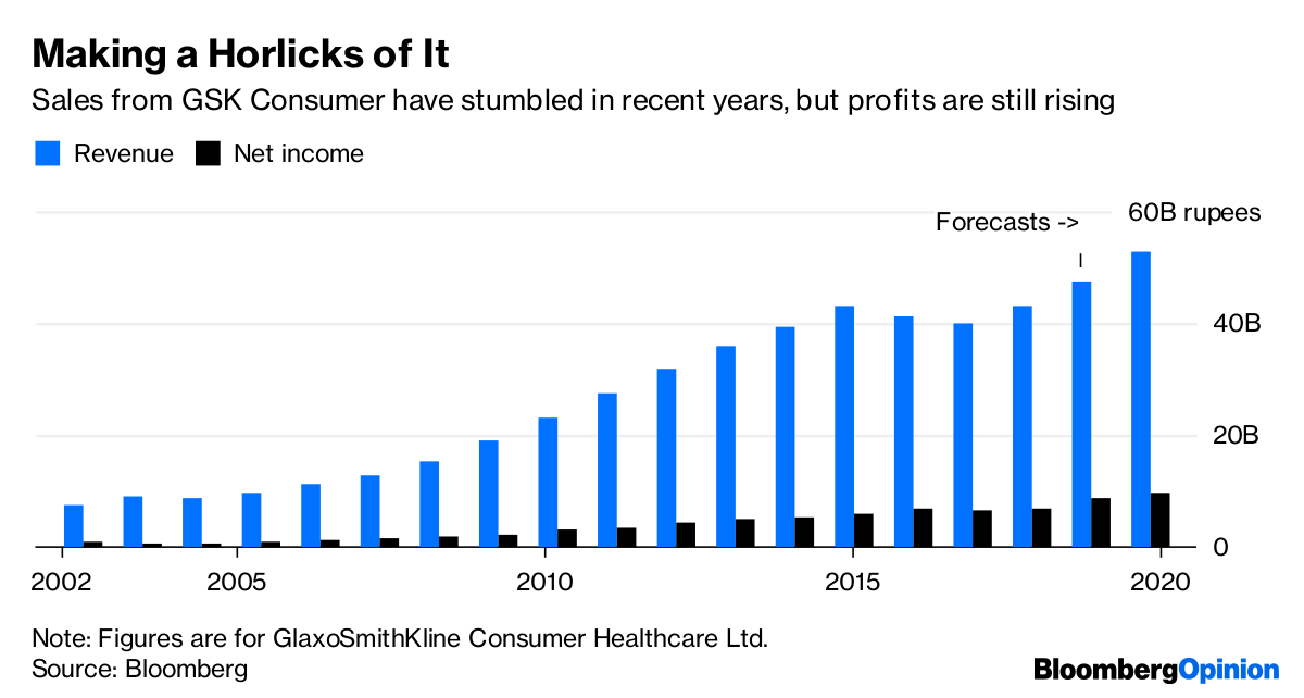 Despite those headwinds, tying GSK’s still-potent brand to Unilever’s peerless local distribution network seems like the best way to secure the future of this business. With a price-earnings ratio that’s below its net income growth rate, GSK Consumer doesn’t look particularly expensive for an Indian food and drinks company. With luck, this cup of Horlicks will provide some youthful energy to its new owner, rather than a geriatric slumber. –Bloomberg
