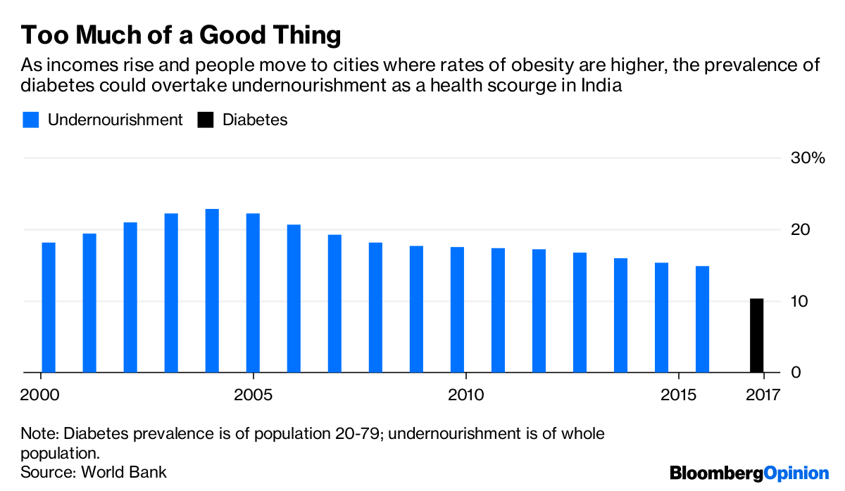 India’s breakneck income growth is introducing a whole new set of health problems. A milk drink made from powdered Horlicks is about one-fifth sugar – and diabetes is India’s fastest-growing health condition, affecting 10.4 per cent of the adult population. On current trends, the disease could soon claim more victims than undernourishment, which impacts 14.8 per cent of Indians.