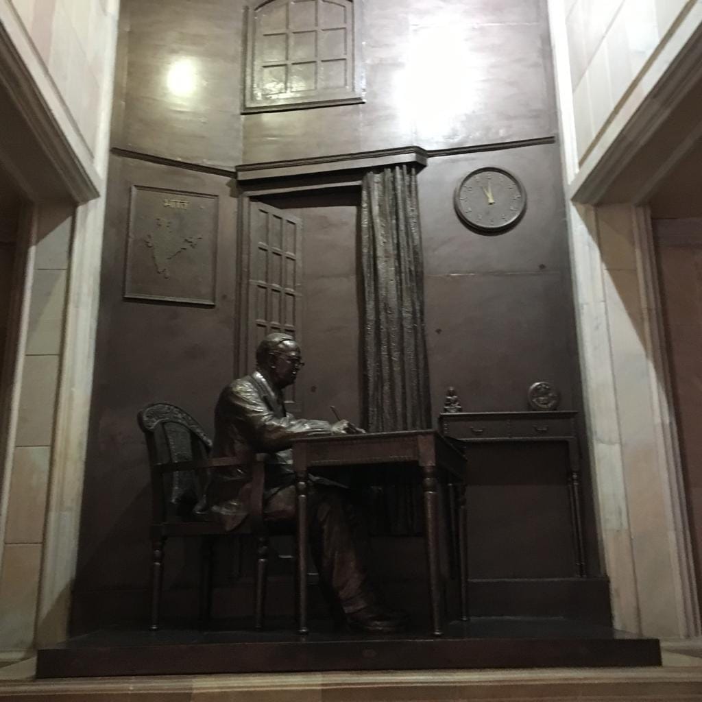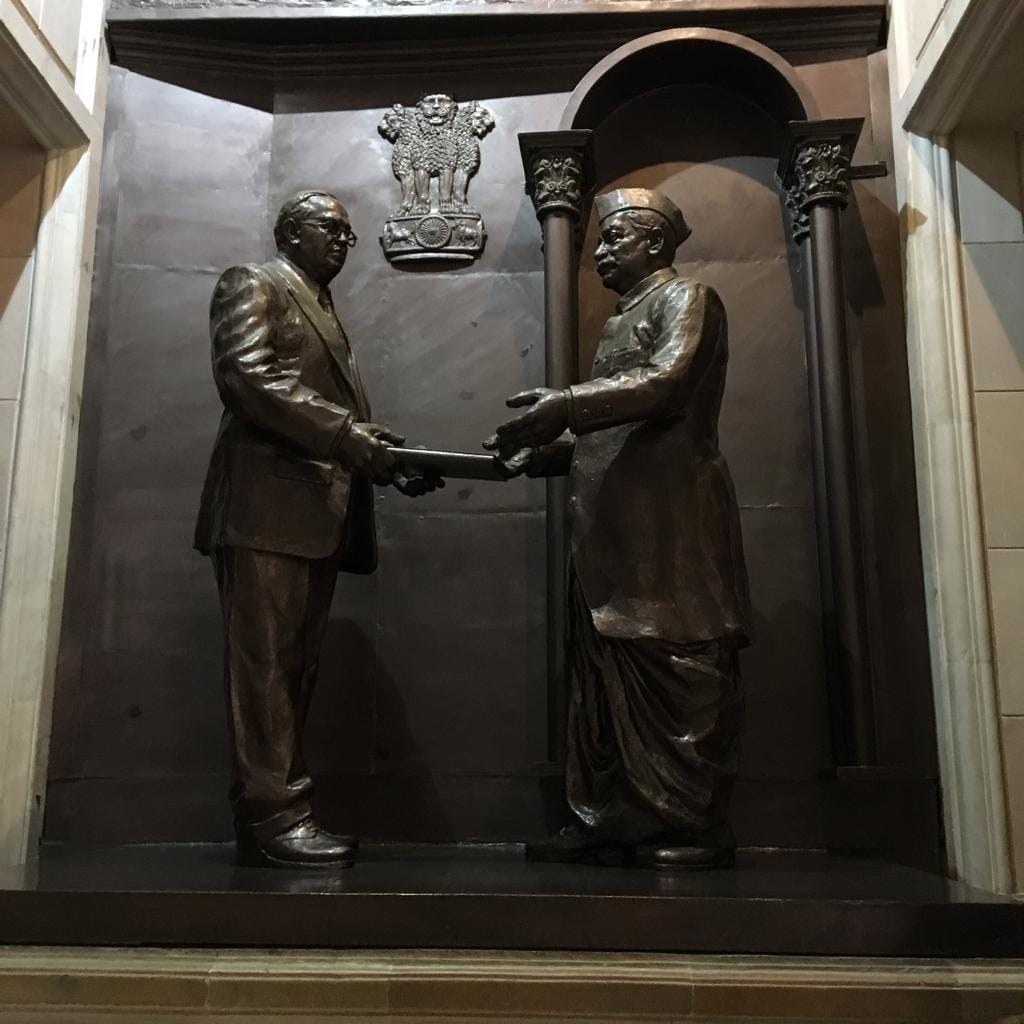 On either side, like the stations of the cross in a cathedral, a sequence of different moments of Ambedkar’s life are cast in bronze. The dominant portrayals of him are as the architect of the Indian Constitution, and of his late conversion to Buddhism as the religion of fraternity.