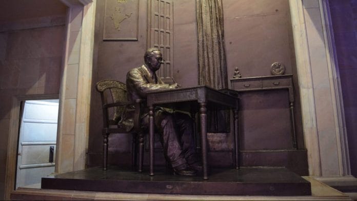On either side, like the stations of the cross in a cathedral, a sequence of different moments of Ambedkar’s life are cast in bronze. The dominant portrayals of him are as the architect of the Indian Constitution, and of his late conversion to Buddhism as the religion of fraternity.