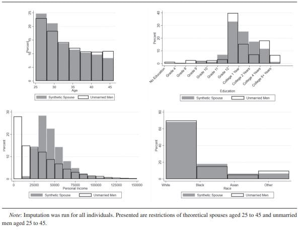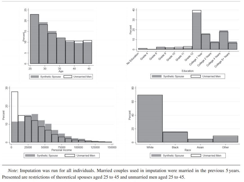 In Figures 1 and 2, we overlaid the distribution of age, income, education, and race of the synthetic spouses and the unmarried men observed in these data.