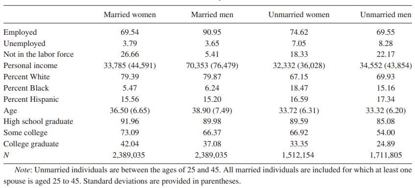 For example, the average total personal income of married men is $70,000 compared with $35,000 for unmarried men (measured in 2017 dollars). Thirty-seven per cent of married men are college graduates compared with only 25 per cent of unmarried men. Although the difference is small in absolute terms, the relative difference in employment status is large. About twice as many unmarried as married women are unemployed (7.05 per cent vs. 3.79 per cent). The largest relative difference between married versus unmarried women is the percentage Black (6 per cent vs. 18 per cent), a result that highlights the persistent marriage gap between Blacks and Whites.