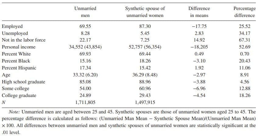 The synthetic spouses (Table 2) had an average income that was about 55 per cent higher ($53,000 vs. $35,000), were 26 per cent more likely to be employed (87 per cent vs. 70 per cent), and were 18 per cent more likely to have a college degree (29 per cent vs. 25 per cent) than the actual unmarried men who were available in the United States. These estimates suggested large differences in the demand and supply of unmarried men with certain characteristics.
