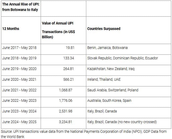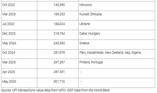 Examining it in another way, since its launch in December 2016, the value of transactions on UPI has added the equivalent of a country almost every month: it crossed Finland and Portugal in May 2025, New Zealand in October 2024, Greece in May 2024, Qatar and Hungary in December 2023—see Table 2.