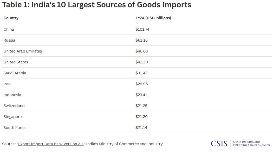 But this commercial promise of bilateral economic integration is only part of the reason for getting a good deal done fast. If China plans to continue an export-oriented growth strategy well into the future, exporting products to India must be considered a vital goal for the reasons outlined in the preceding paragraph. The related surpluses provide China with the resources required for military modernization and for bankrolling regional infrastructure programs. They also allow Chinese manufacturers to further scale up and drive down production costs—including in sectors with dual-use capabilities such as computers, drones, rare earth magnets, quantum computers, navigation systems, marine vessels, communications infrastructure, robotics, and more. China is already the largest source of India’s imports by a significant margin and, despite measures to slow imports by the Indian government, its share continues to grow, as indicated by Table 1.