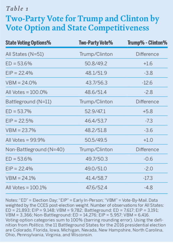 Our assessment of voting behaviour is sequential. Table 1 displays the portion of voters using ED, EIP, and VBM options and the two-party split in the presidential vote among those CCES respondents in All States (including Washington, DC), Battleground States, and Non-Battleground States. The right-most column in table 1 shows the percentage-point difference in the two-party vote: Trump minus Clinton, for every category of voter (i.e., ED, EIP, VBM, and All Votes).