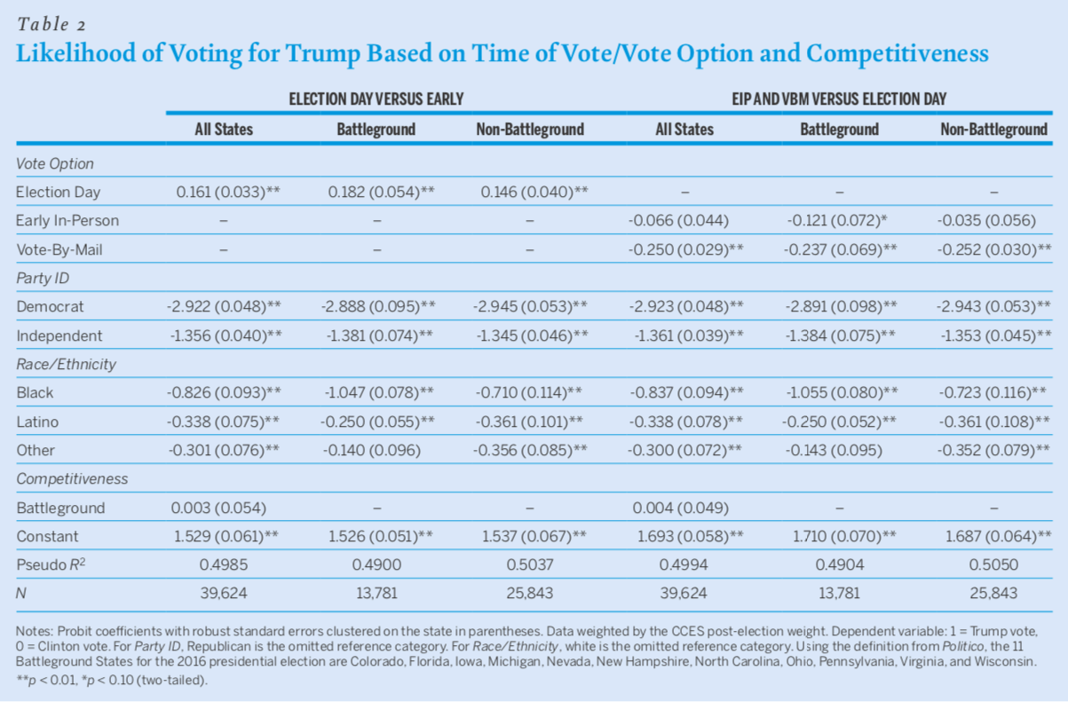 Throughout this study, we relied on CCES respondents’ self-reports of their presidential vote choice and whether their method for casting a vote was EIP, VBM, or ED. Given the wording of CCES’s question for vote method, it was clear that voters who reported voting EIP or VBM did so prior to 8 November 2016. This was critical for our analysis because our fundamental point is that ED voters throughout the nation — particularly in the battleground states that decided the outcome of the 2016 presidential election — were significantly more likely to support Trump vis-à-vis Early voters (i.e., CCES respondents who voted EIP or VBM). We adopted Politico’s definition of presidential battleground states in 2016: Colorado, Florida, Iowa, Michigan, Nevada, New Hampshire, North Carolina, Ohio, Pennsylvania, Virginia, and Wisconsin. These 11 swing states arguably comprise a consensus list, given candidate visits, resource allocation, and media “horserace” coverage of the election.