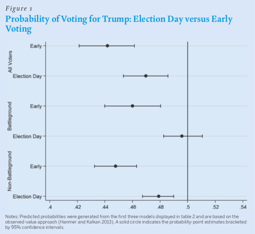The evidence that it was ED voters in the key swing states that turned the Electoral College in favor of Trump is unmistakable. First, in the All States model (labeled “All Voters” in the figure, which includes a Battleground States dummy), the probabilities overlap at the 95 per cent confidence interval for ED and Early voters. Second, in the Non-Battleground States model, the probability of voting for Trump is clearly greater for ED voters than Early voters, but Trump still netted less than half of the two-party vote irrespective of voting mode (also true in the probability estimates for All Voters). Finally, only in the Battleground States model did we find that the confidence interval spans 0.50. This is the case only among ED voters, who were significantly more likely to vote for Trump vis-à-vis Early voters (because the confidence intervals do not overlap).