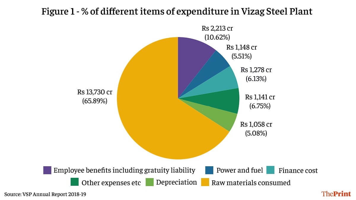 Being the only steel-manufacturing PSU without captive mines, the Vizag Steel Plant spends significantly higher on raw material than other steel plants in the country. While firms with captive mines spend Rs 1,500 per tonne on iron ore, VSP spends Rs 7,000. Hence, the raw material expenditure of SAIL and Tata Steel, which have captive mines, is 48 per cent and 35 per cent respectively of the total cost. For VSP, it is a whopping 65 per cent (Figure 1). By making VSP operate without captive mines, it is being forced to bleed to make it look like a loss-making company to shareholders.