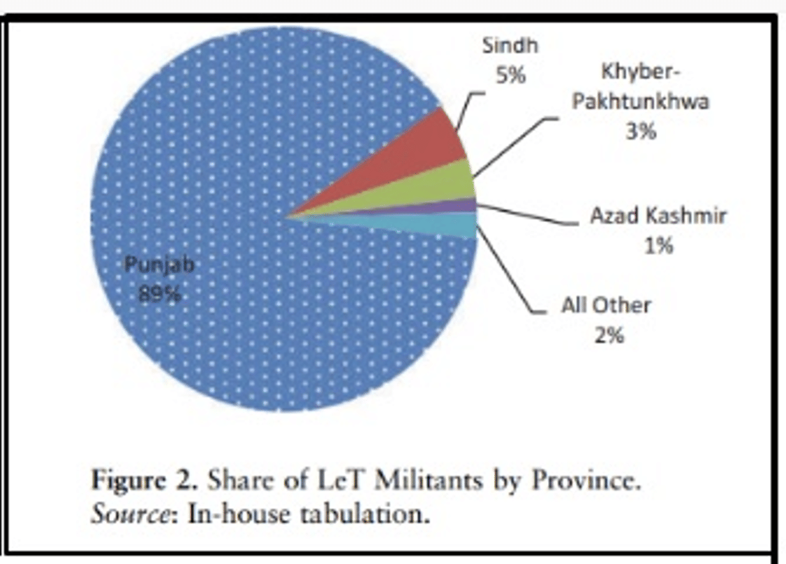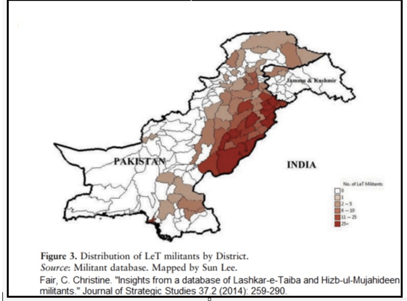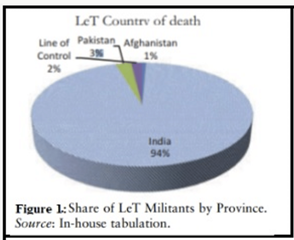 Lashkar has long claimed to be a Kashmiri Tanzeem, comprising Kashmiris fighting for Kashmiris and dying in Kashmir. But it has long been suspected and recent data somewhat demonstrates that only the latter claim is true (See Figure 1). Whereas some 90 per cent die in India, and over 90 per cent of its cadres come from a mere ten districts in Pakistan’sPunjab. A meagre 1 per cent come from Pakistan-occupied Kashmir. Irrespective of the LeT’s claim to be a “Kashmiri” organisation, it is by all measure a Punjabi organisation.