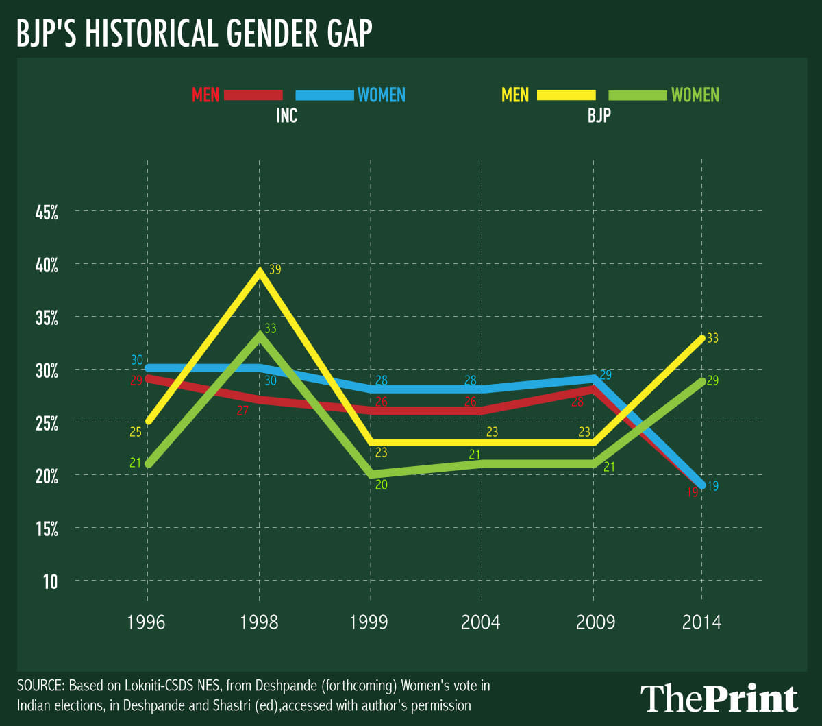 But here’s the problem: CSDS’s 2019 poll finds the opposite — a higher share of men than women still prefer the BJP and its allies, while a slightly higher share of women than men prefer the Congress. It essentially means that the trend from CSDS’ past National Election Studies holds true.