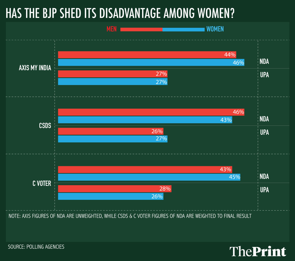 The Axis and CVoter exit polls find that a larger share of female voters than male voters chose the BJP and its allies. While Axis finds no difference between male and female preference for the Congress and its allies, CVoter finds that a larger share of men than women preferred the UPA. While the difference in preferences may appear to be small, it could upend conventional wisdom; until now, CSDS polls have been the main source of scholarship on electoral issues, and have found that the BJP has had a historical disadvantage among women, and the Congress a historical advantage.