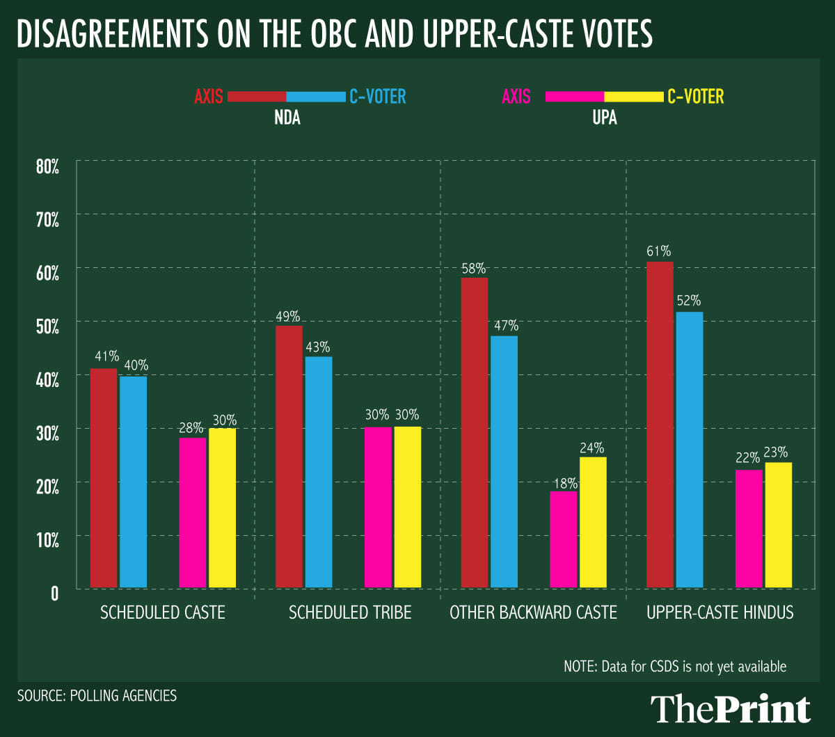 Finally, on caste-wise voting patterns, CSDS data for the country as a whole is not yet available, but there is wide variation between Axis and CVoter on the OBC and upper caste vote.