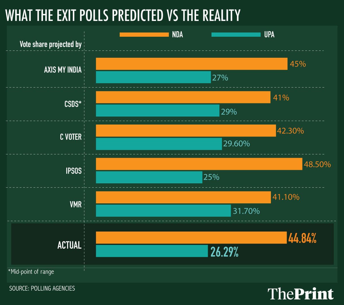 Of all the exit polls published on May 19, only three have put out detailed data and are seen as relatively credible. For this analysis, we will look only at voteshare, and not seats, as it is more relevant to the central point. The voteshare projections come from conducting a representative sample survey, and then projecting what share of the sample intends to vote for each alliance. While India Today-Axis My India surveyed every constituency, CSDS and CVoter surveyed a sub-set of constituencies based on which they projected voteshare for each state.