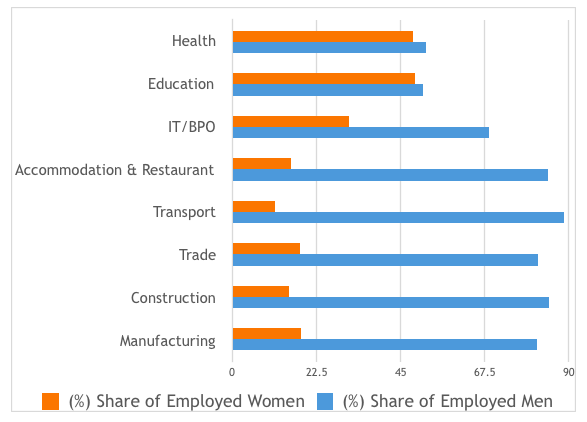 As argued earlier in a detailed analysis on sector-wise differences in the female-male labour force participation rate (among the working age population group of 15-45 years), we noted how even though women’s literacy levels in primary areas of education (government and private) have increased considerably over the last two decades (thanks to the Right To Education (RTE) and other state-focused programmes), the enrolment numbers for women in secondary and tertiary areas of education (especially in rural and semi-urban areas) still remain highly unequal—the latter is a major concern.