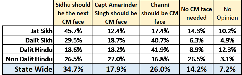 On who should be the Congress party’s CM face in the next election, Navjot Singh Sidhu emerged as the most popular choice followed by the new CM, Charanjit Singh Channi. Capt. Amarinder Singh was a distant third among the three but still holds support among non-Dalit Hindus.