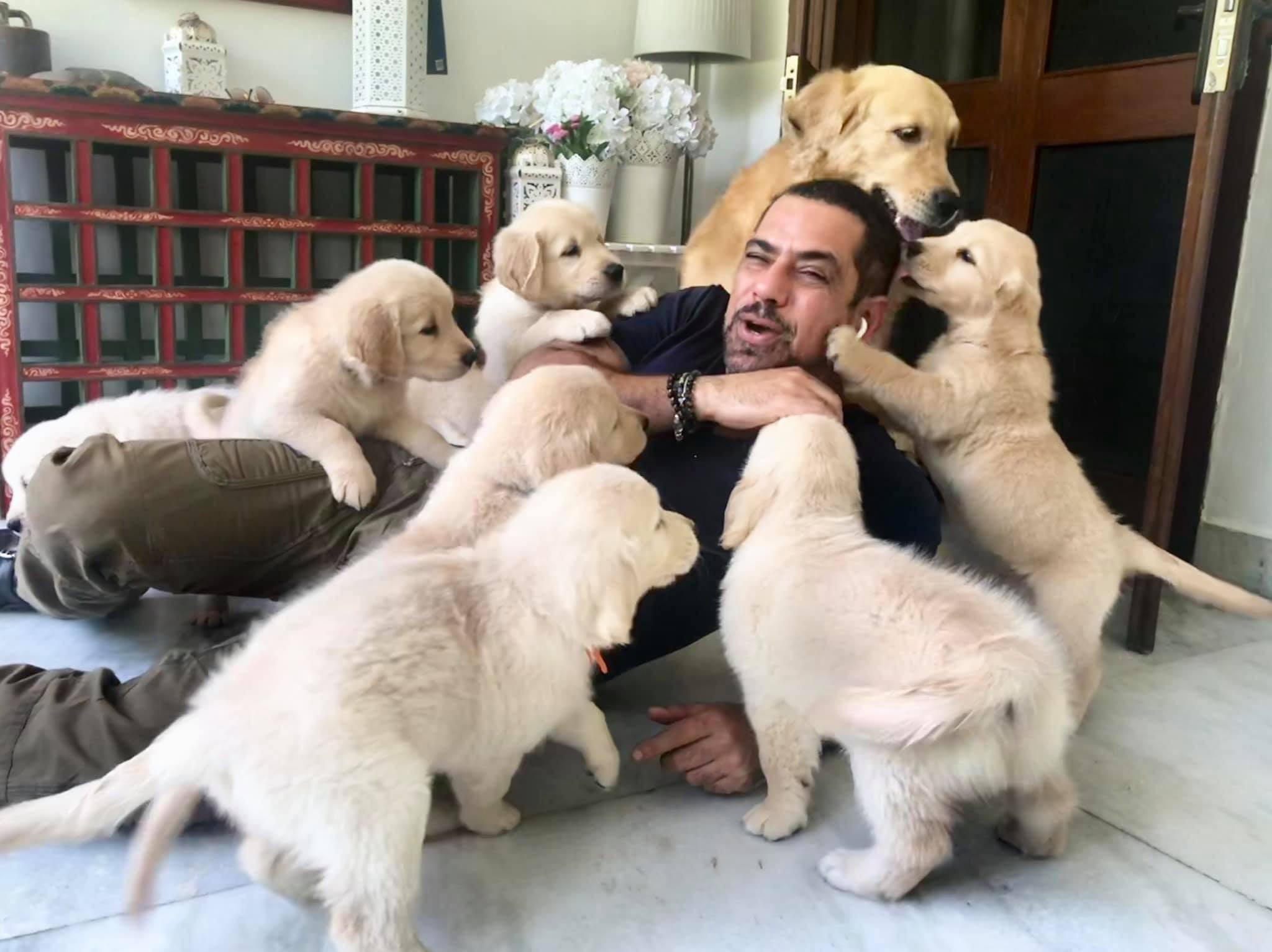 His golden retriever puppies can’t have enough of him: