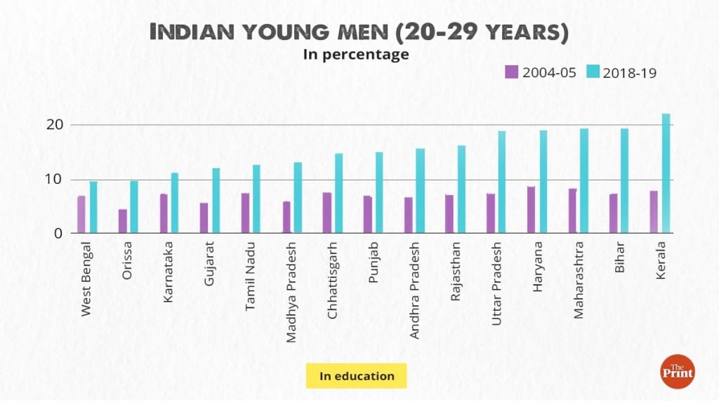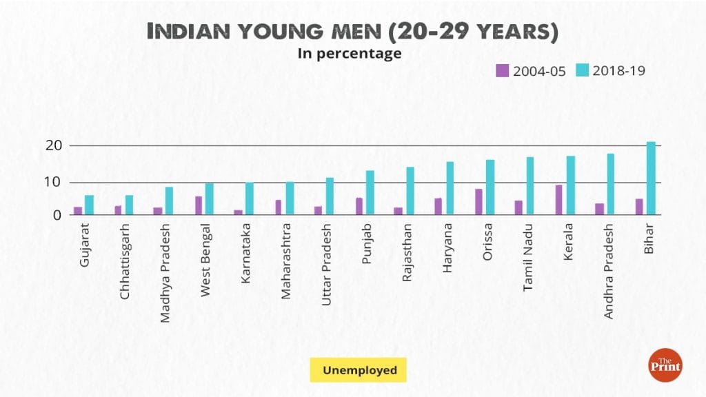 Among India’s young men, unemployment rose across all major states by 2018-19 from 2004-05. Further, the regional variation in unemployment of young men has risen sharply as well, reflecting a divergence in their economic performance and suggesting a higher shortfall of jobs in certain states. While in 2004-05, the unemployed-to-population ratio of young adults ranged from 1.5 per cent (Karnataka) to 8.9 per cent (Kerala), the range had more than doubled by 2018-19, with the least being 5.8 per cent (Gujarat) and the highest 21 per cent (Bihar). Similarly, while the proportion of young men in education has risen in all states, the regional variation has increased well.