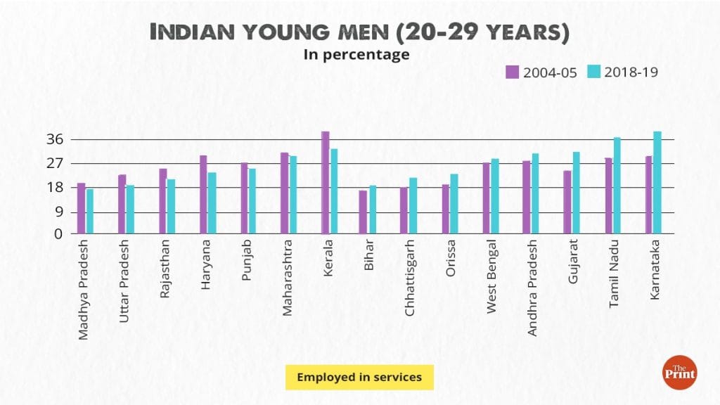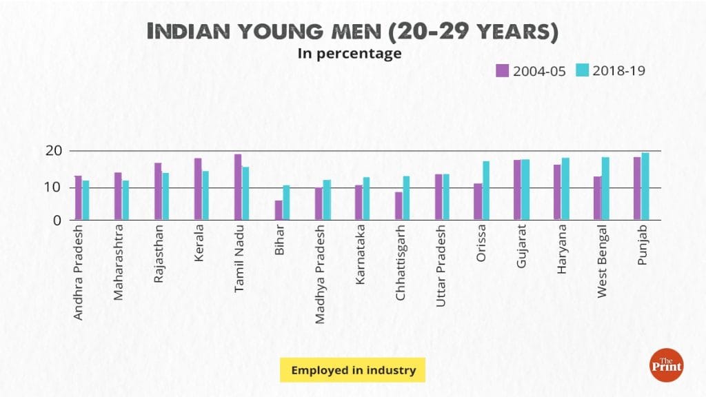 It is noteworthy that Punjab, Haryana, and West Bengal have seen a rise in industrial employment, which includes construction sector work, among young men. India’s most populous state, Uttar Pradesh, however, witnessed a decline in the proportion of young men employed in services and near-stagnation in industrial employment. Given that nearly 16 per cent of young men in India or 14.5 million are in Uttar Pradesh, if the New Employment Policy can provide incentives for job creation, in both industry and services in the state, it would also lower the pressure on migration.