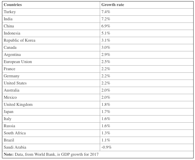 - Only four countries grew by more than 3.5% in 2017 — Turkey, India, China and Indonesia.