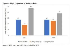 Similarly, during the Gujarat assembly election last year, intensive rallying by Modi with all sorts of appeals towards the end of the campaign made a difference for the BJP in what could have turned out to be a very close election. The BJP led by 15 percentage points among late deciders while it had trailed by two points among those who had decided prior to campaigning.